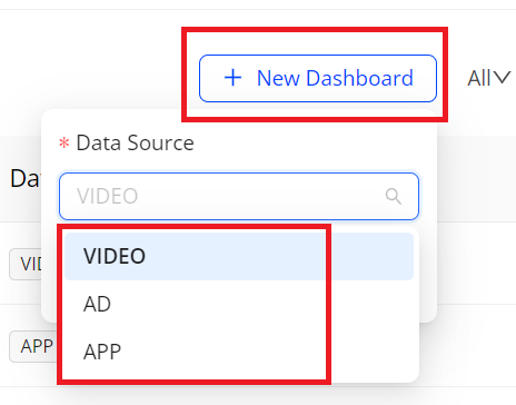 Note: When creating a dashboard, you can only select one data source type. The available data source types depend on your account access.