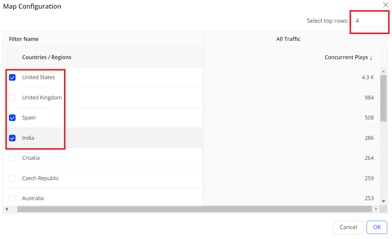 For example, if you want to check the ended plays in three countries including United States, Spain, and India, ensure to select the related checkboxes. When the configuration is complete, the bar exclusively presents data for these three countries.