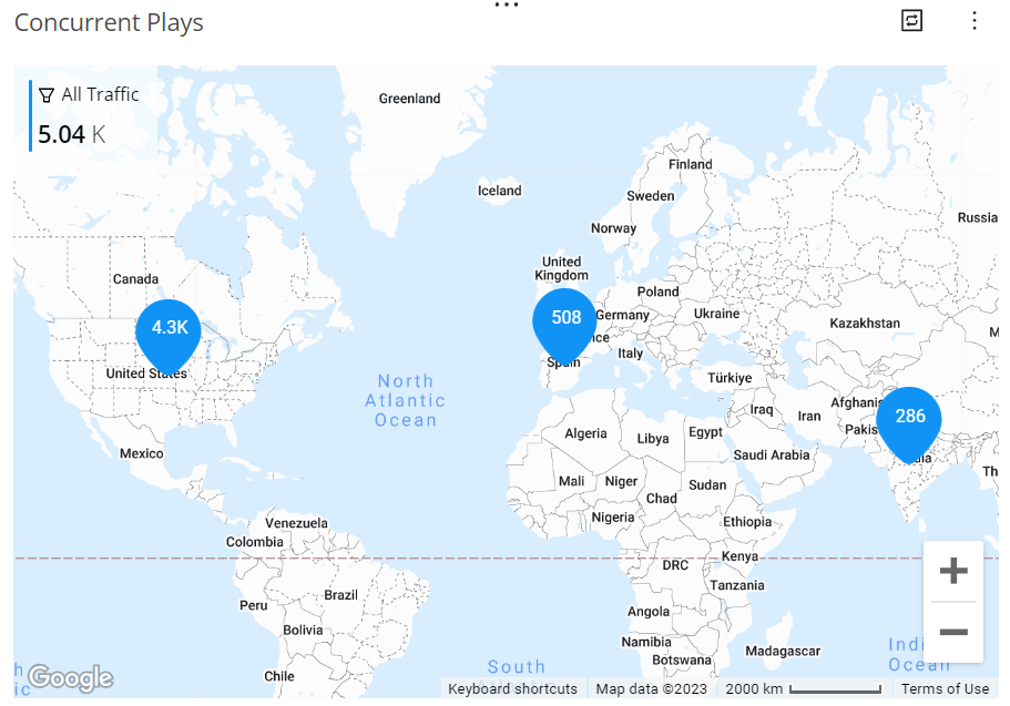 This image shows that the total concurrent plays for the VOD traffic are 4.5 K. Hovering over a country, such as United States, reveals the country name and metric values.