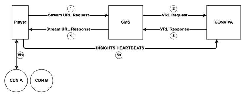- The Conviva VSI session started and correlated to the Precision Decision by means of a Request Identifier (c3.ri) which is returned in the VRL response and appended to the stream URL as a query parameter (recommended) or Client IP address (alternative).