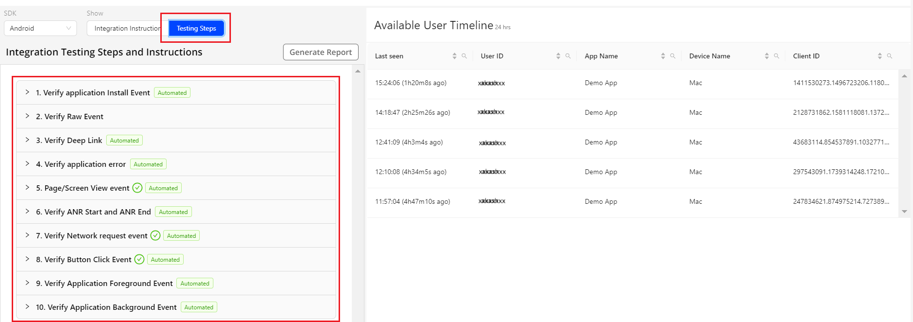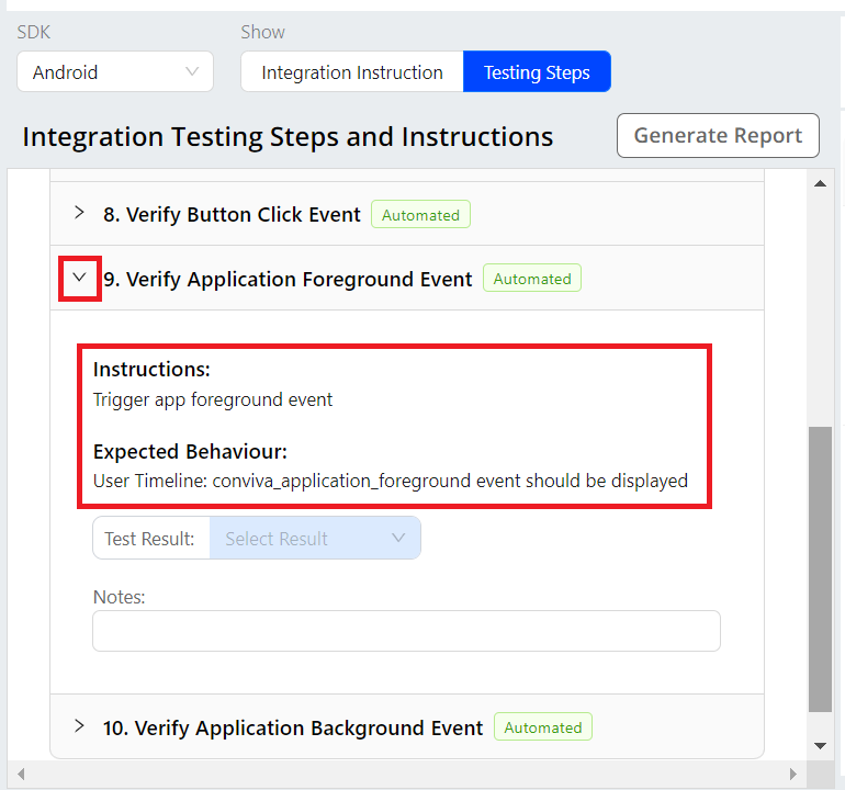 The Testing Steps tab shows platform-specific test cases. Expand each test case to see the instruction and the expected behavior. In the application, you need to simulate the test instruction and verify whether the test result is matching with the expected behavior.