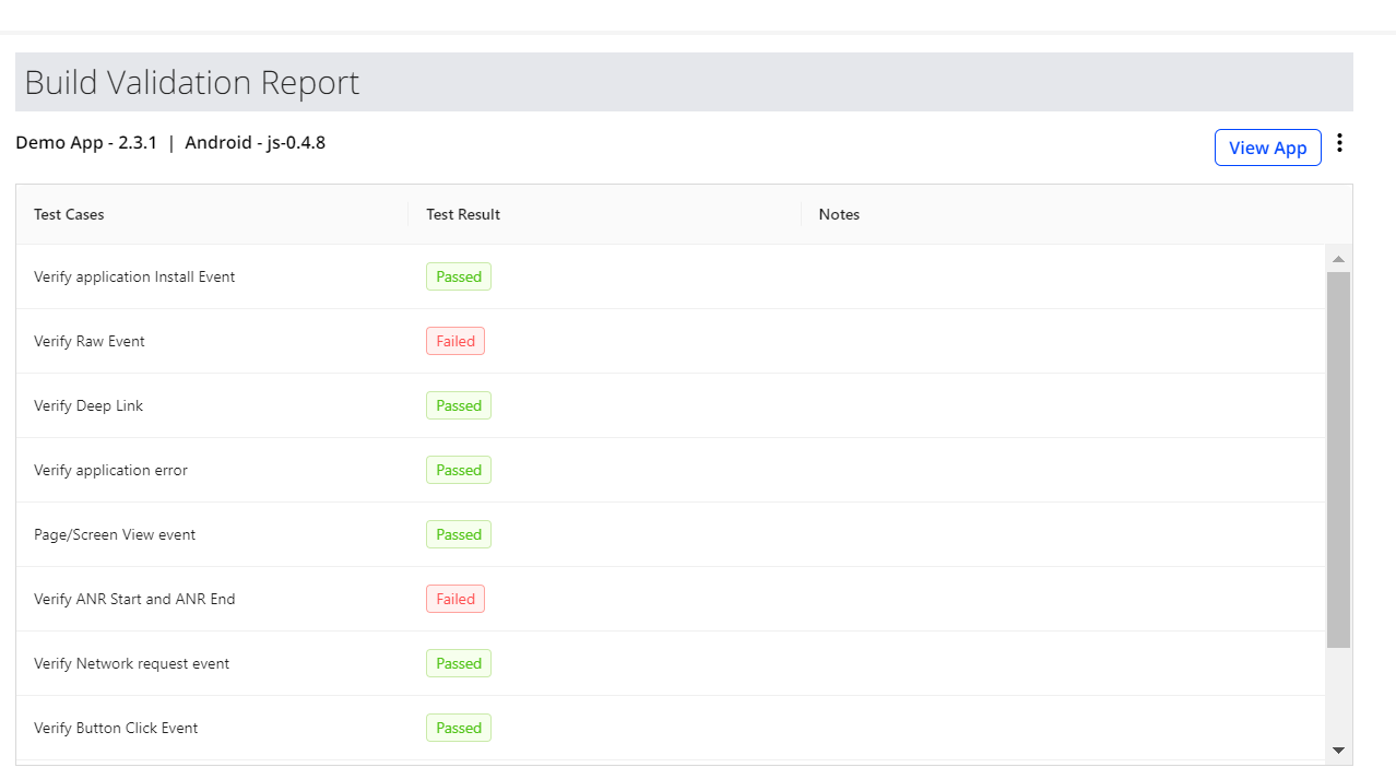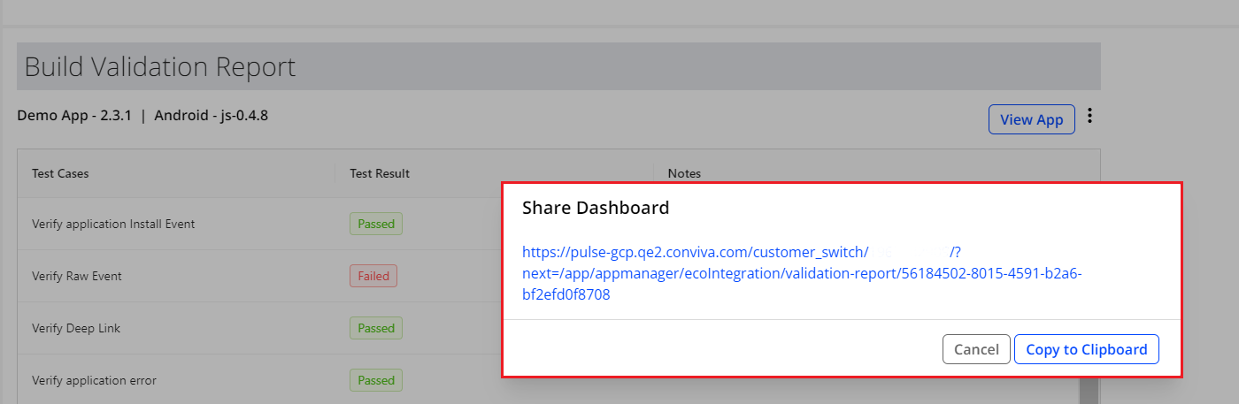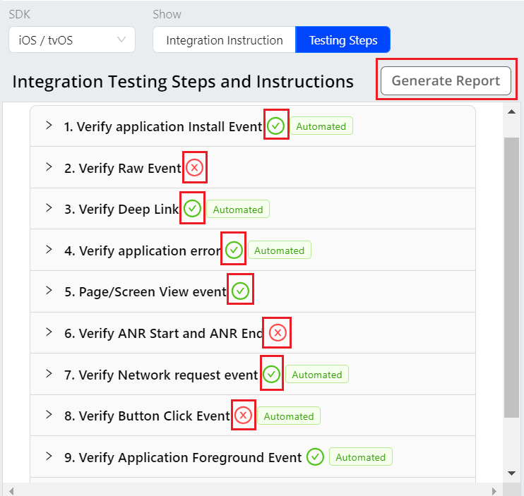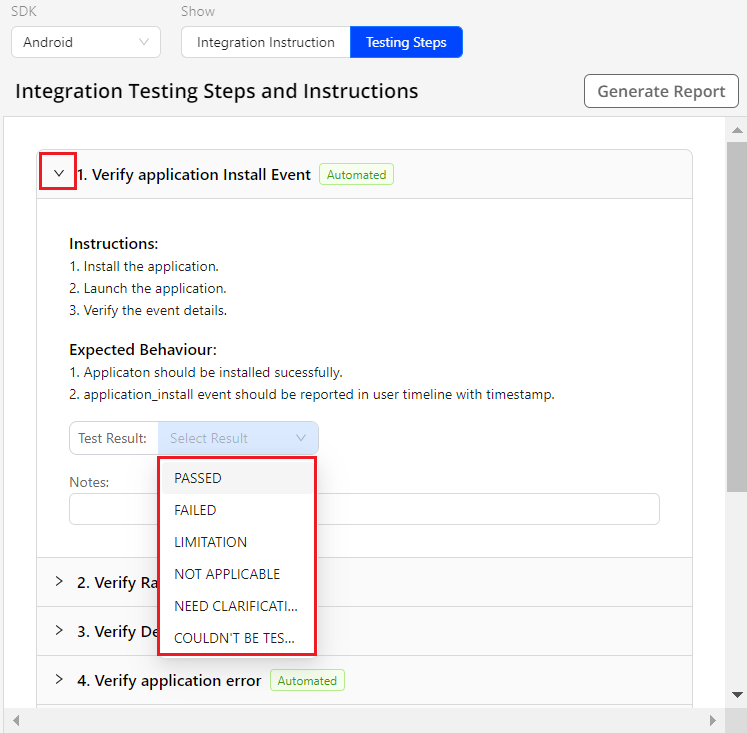 Verify the events in the user timeline and then update the Test Result for all test cases. For auto-collect events, the test result gets updated automatically. After you finish executing all the test cases, generate the report. You can view the report and share the report URL with the user.