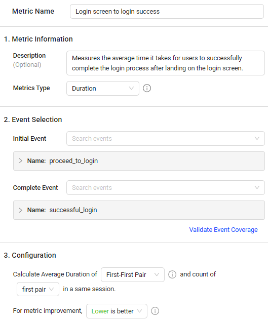 For example, measure login start to login success accurately, without considering account creation during the flow that may inflate the duration of login metrics.