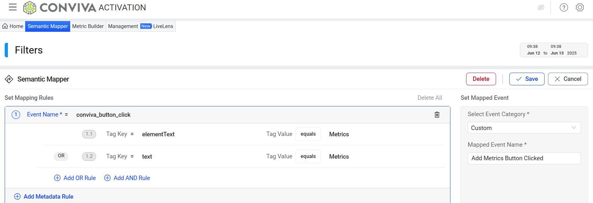 Metric Builder: enables creating flows and custom metrics associated with specified initial/follow-up events to analyze data for complex user actions and app performance scenarios. Use Conviva predefined metrics for quick metric creation or map raw events with Semantic Mapper for specialized metrics.