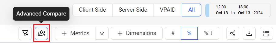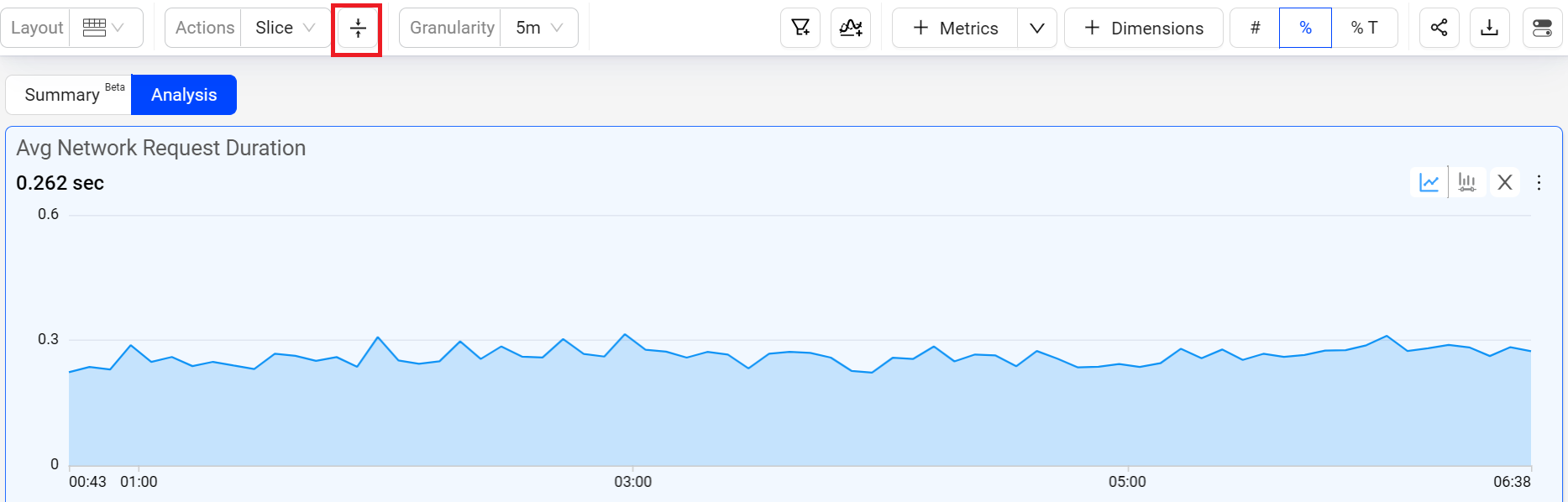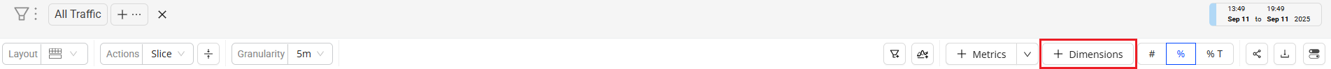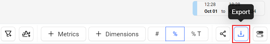 The %T toggle option displays the metric value for each dimension as a percentage of the total dimension metric value within the selected time period.