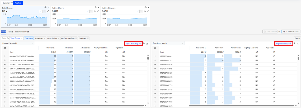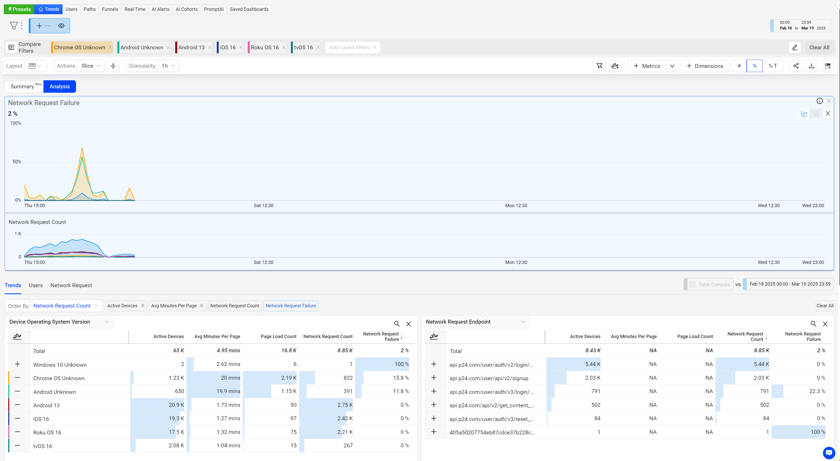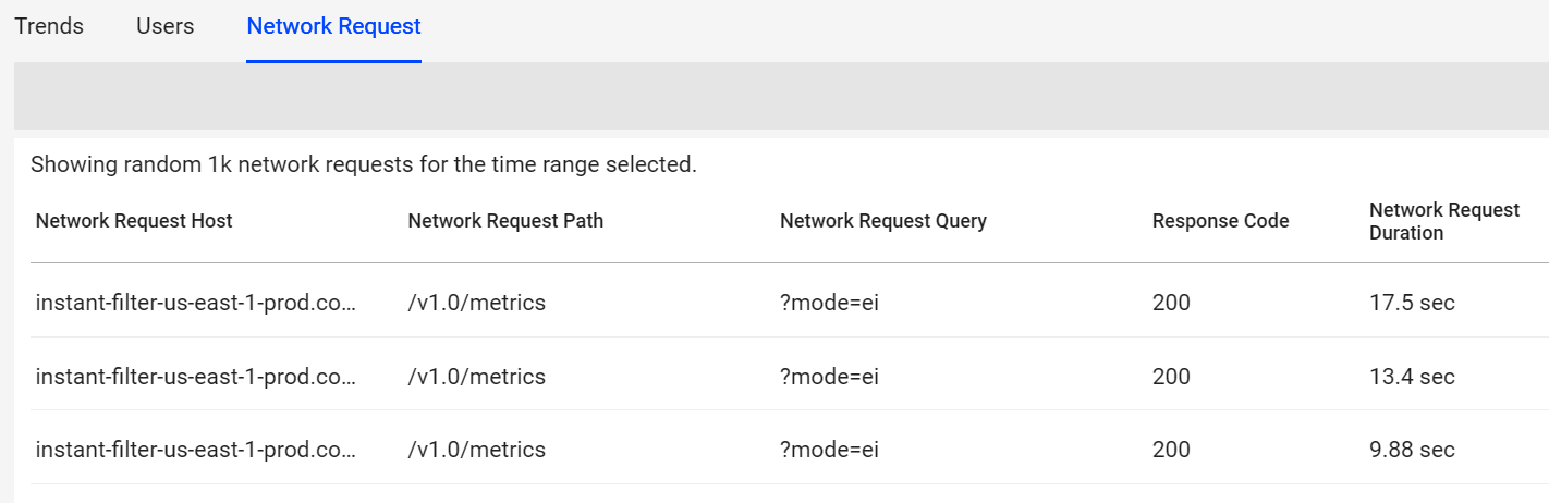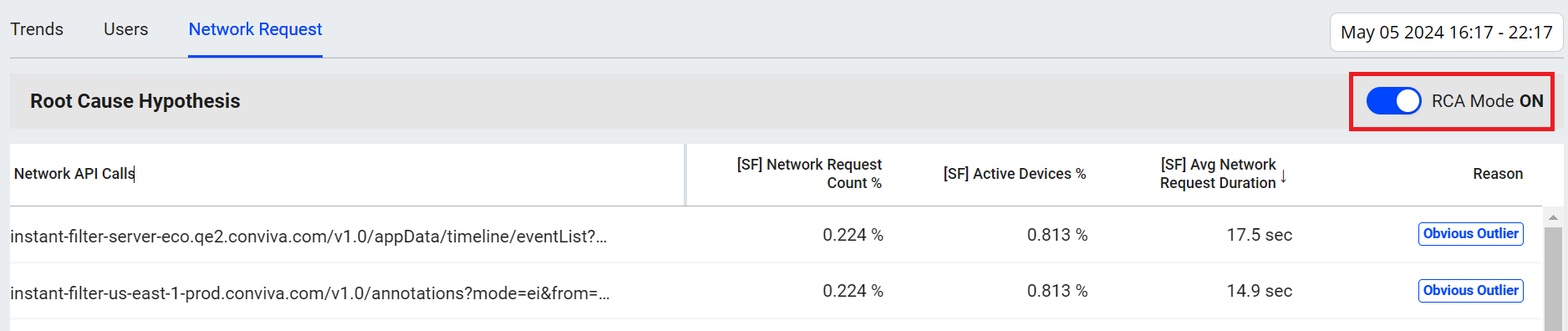In the Trends Network Request tab, RCA mode enables easy detection and quick analysis of network response root causes. The Root Cause Hypothesis table displays the network API calls with the longest durations among the sessions. This mode also displays other analysis data related to the API calls such as network request count and active devices percentages.