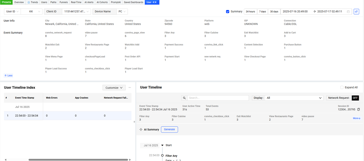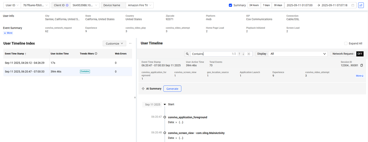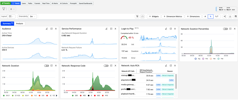 The Trends dashboard provides an easy-to-use interface with an advanced feature set, enabling real-time and historical, real-user experience monitoring connected wth backend network service performance for deep understanding of how application performance and network service health impacted user experience. Customized dimensional drill-downs support app and user experience Service Level Indicators (SLIs) based on engagement metrics, QoE and KPI metrics, service performance metrics, and error messages, along with detailed network request and user timeline analysis.