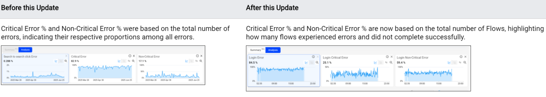 Critical Error %: Number of flows with critical errors that caused the conversion to fail, divided by the total number of flows.