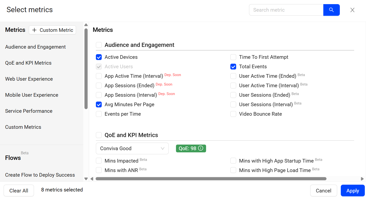To analyze specific metrics, select required metrics and click Apply.