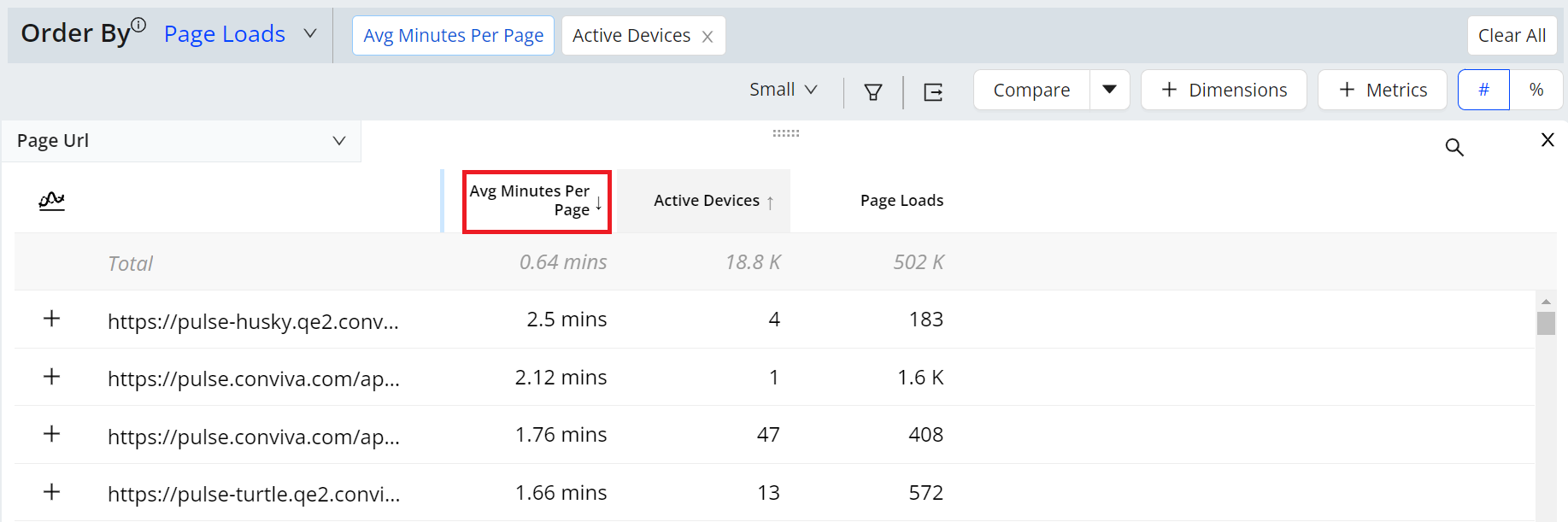 The distribution selection also displays the related metric in the dimension tables for easy impact analysis. In this case, Avg Minutes Per Page is highlighted and enables a quick determination of top page URL use.