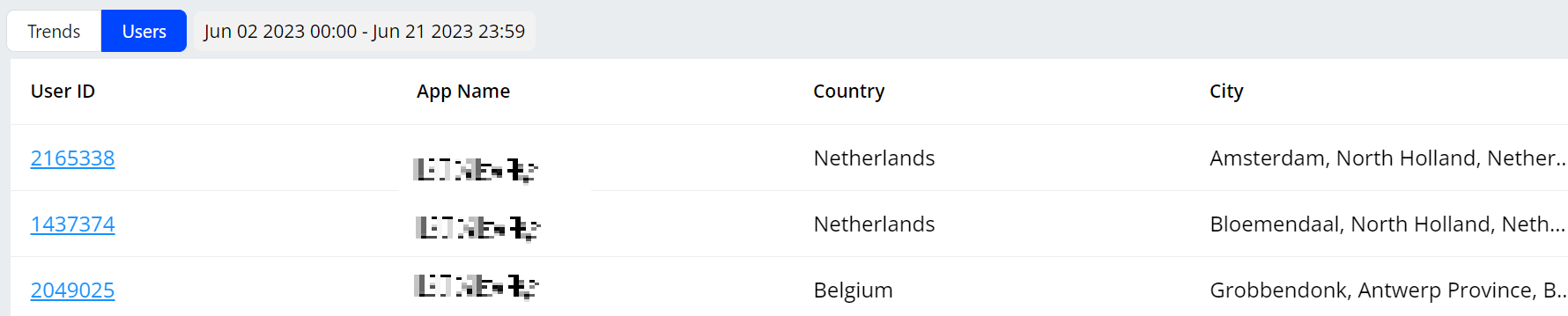 - Dimensions: Select Dimensions to display dimensional data, including trends data and user data. This data supports the analysis of app performance and user behaviours.For more information, see Dimensional Data (Trends and Users).