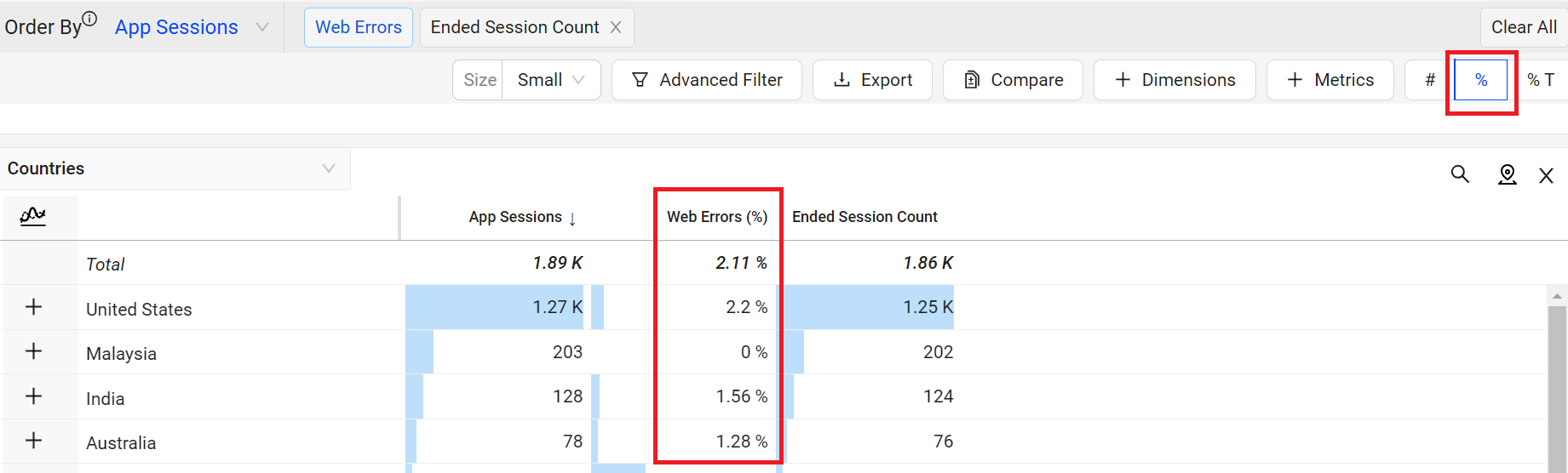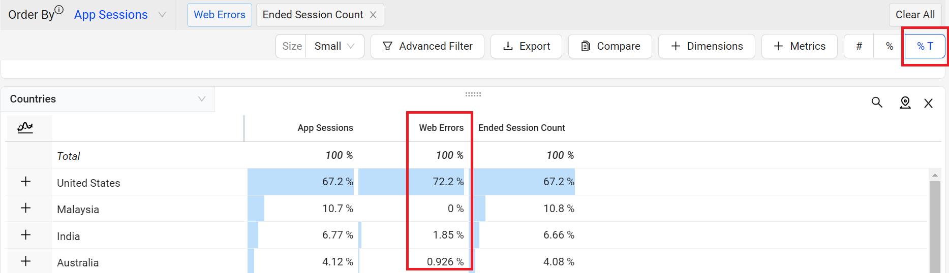 For example, displaying the Web Errors metric as a percentage clarifies which dimension value had the highest percentage of web errors. In this case, it is the United States with 2.2%. The percentage of Web Errors is calculated based on the total web app session count for that dimension value.