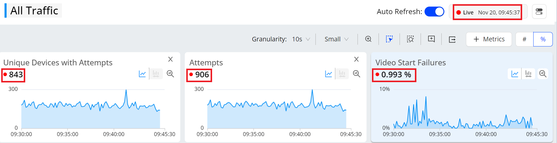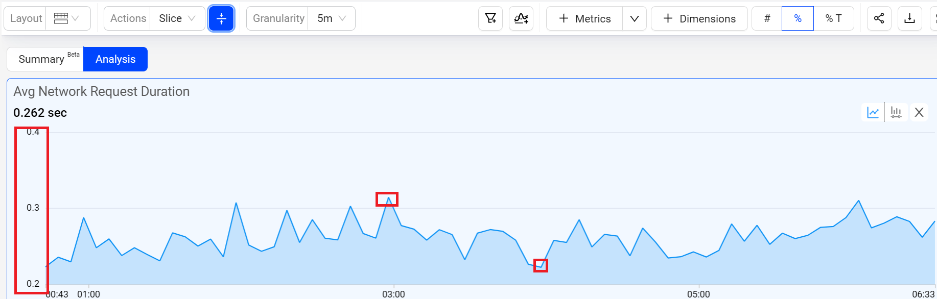 Zoom in on the time slice of data in one metric widget, which then selects the same time slice in the other widgets.