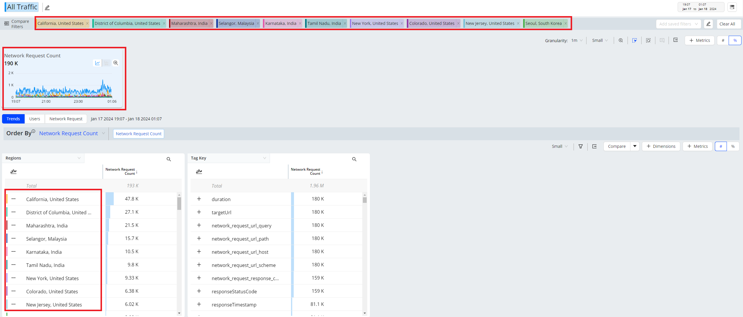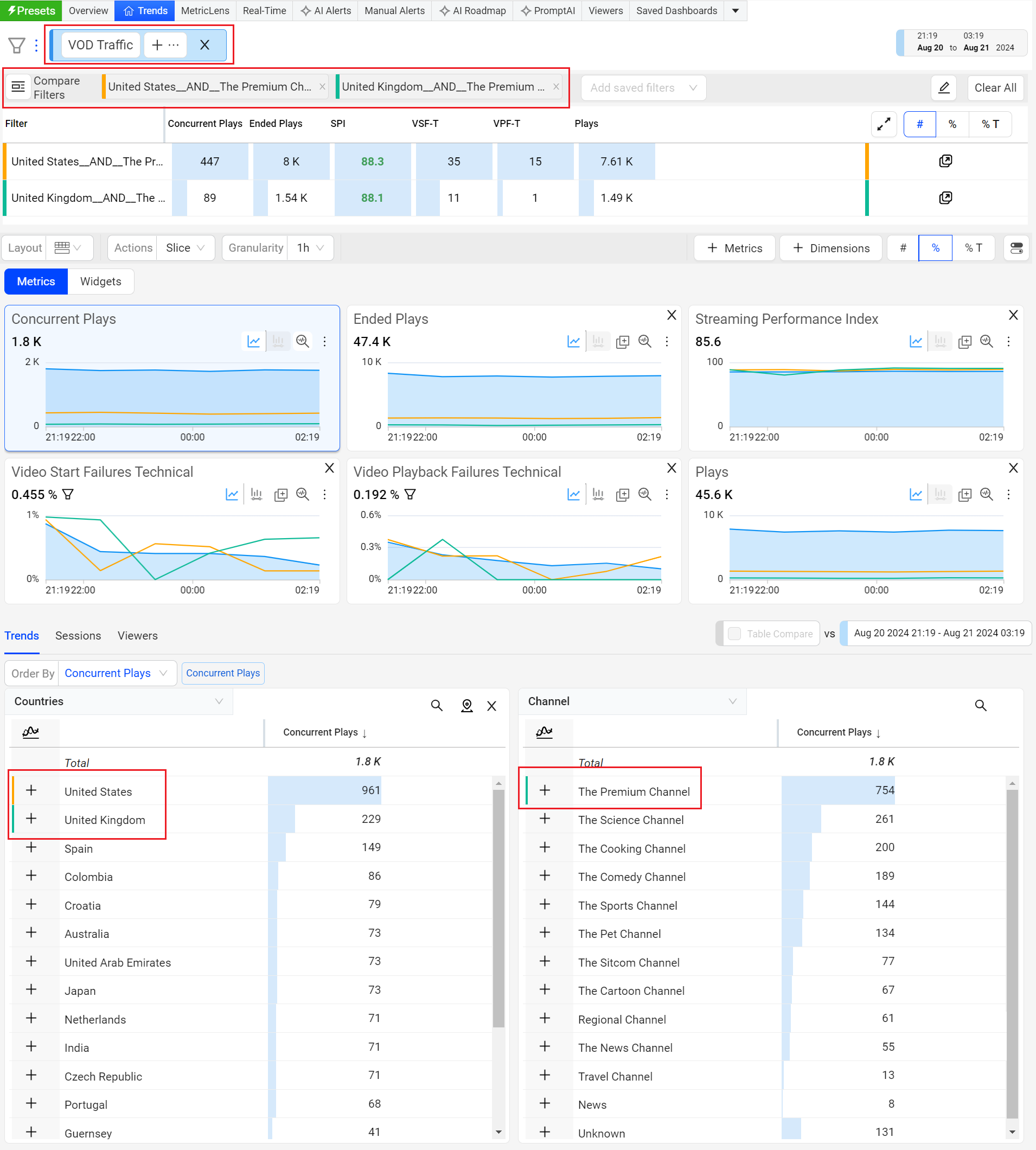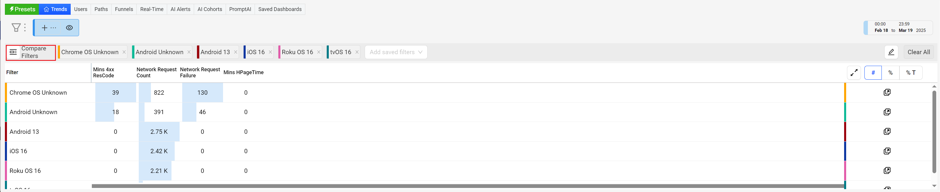 Trends offers instant comparison of filters for the top dimension entities or across a custom dimension filters. Add up to 20 filters to compare the data.