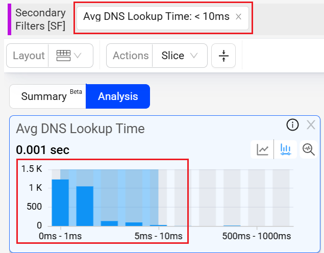 Secondary Filters: Overlay another filter layer on the main filter derived data. Activated by dragging portions of the distribution views in the metric widgets. For example, select areas in the Avg DNS Lookup Time to apply a secondary filter for sessions with potential ABR issues.