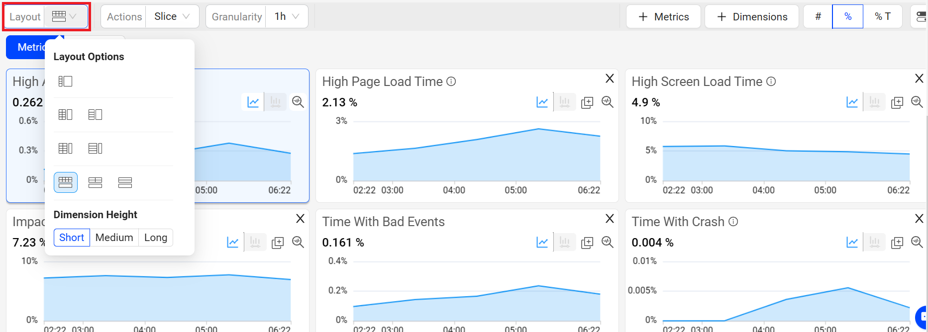 Various metric widget and dimension table sizes, to expand and contract the displayed metric time series and dimension table values