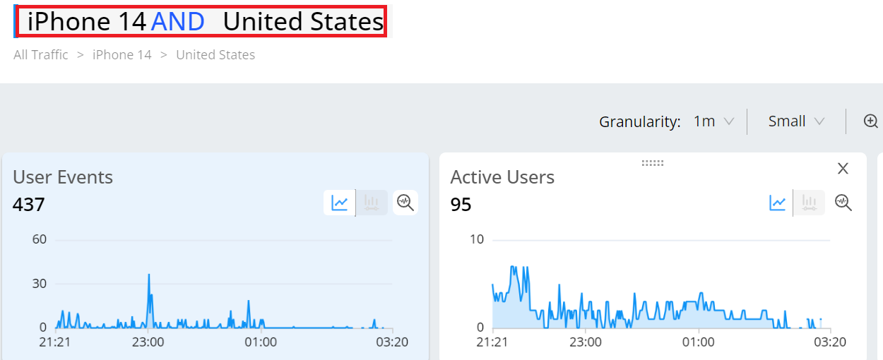 Drag and drop metric widgets to enhance visual comparison. Within a metric widget, drag to select a portion of a time series or distribution to focus analysis on related app sessions. This action zooms the displayed data across all widgets, dimension areas, sessions, and users to the selected session data.