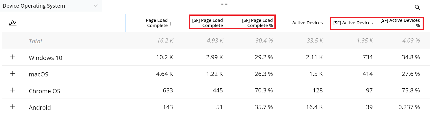Perform dimensional drill-downs to analyze device OS performance.
