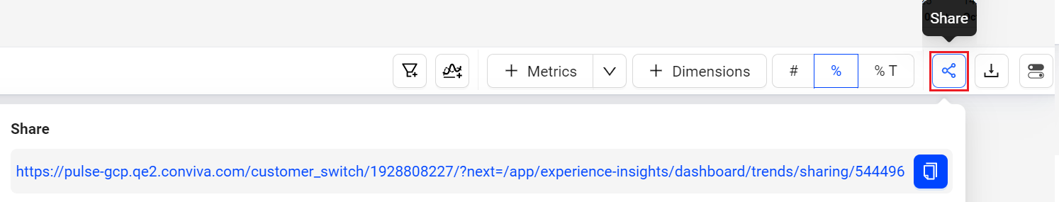 Click the Share icon in the action toolbar to share snapshots of dashboards with other Conviva DPIusers. Clicking the Share icon saves a 30-day snapshot of the item and generates a link for collaboration, shared by copying and pasting the link.
