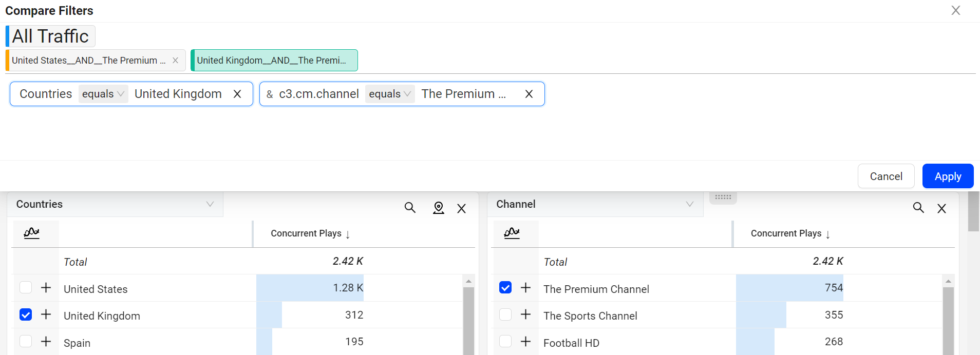 For example, set the advance filter for specific device groups while filtering out irrelevant assets to the performance analysis, such as trailers, older players, and viewers from less relevant geographies.