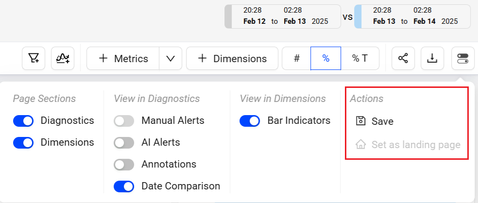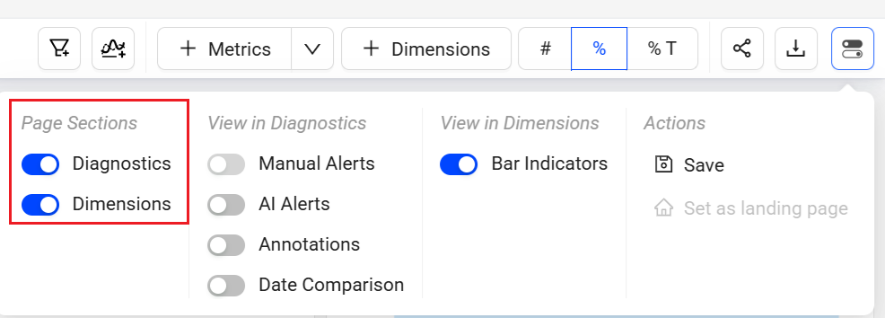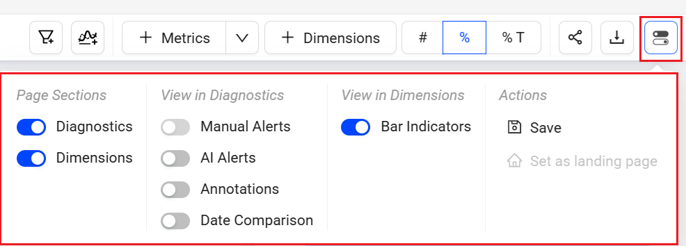 The toggle button at the top right corner selects pages for display on the dashboard, turns on or off view in diagnostics, controls bar indicators in dimensions, and performs actions like sharing the dashboard. Use the quick toggle in the same area to minimize sections on the page.