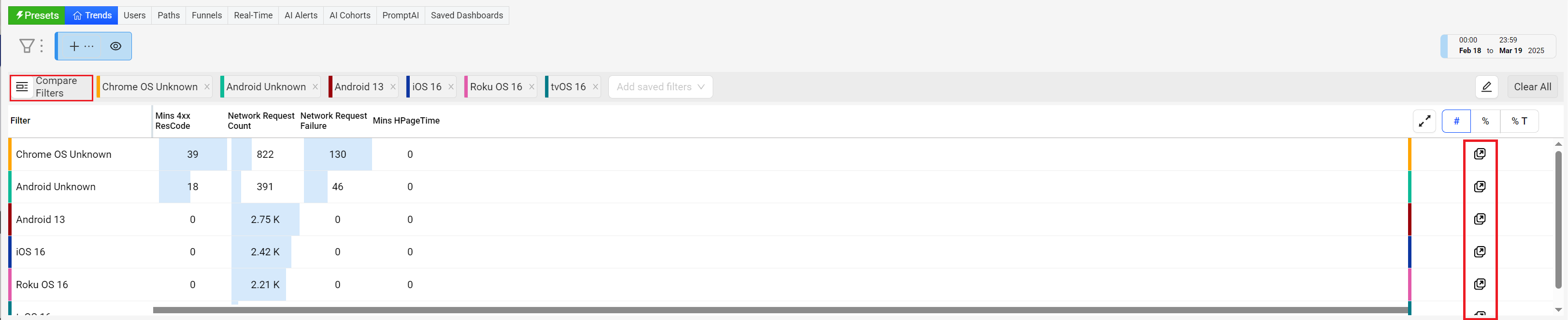 Easily visualize side-by-side comparisons based on advanced filter settings, in the dimension tables with links to Trends.