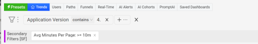 Secondary filters overlay another filter layer on the main filter derived data. This type of filtering can be especially useful for analyzing performance issues across multiple nested dimension areas, such as high Avg Mins Per Page across 4.x app versions to correlate the app versions with high mins per page.