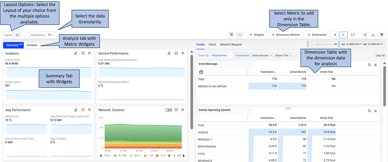 The Trends dashboard offers multiple layout options for metric widget and dimension table positions, allowing customized data display to align data with your analytic preferences.